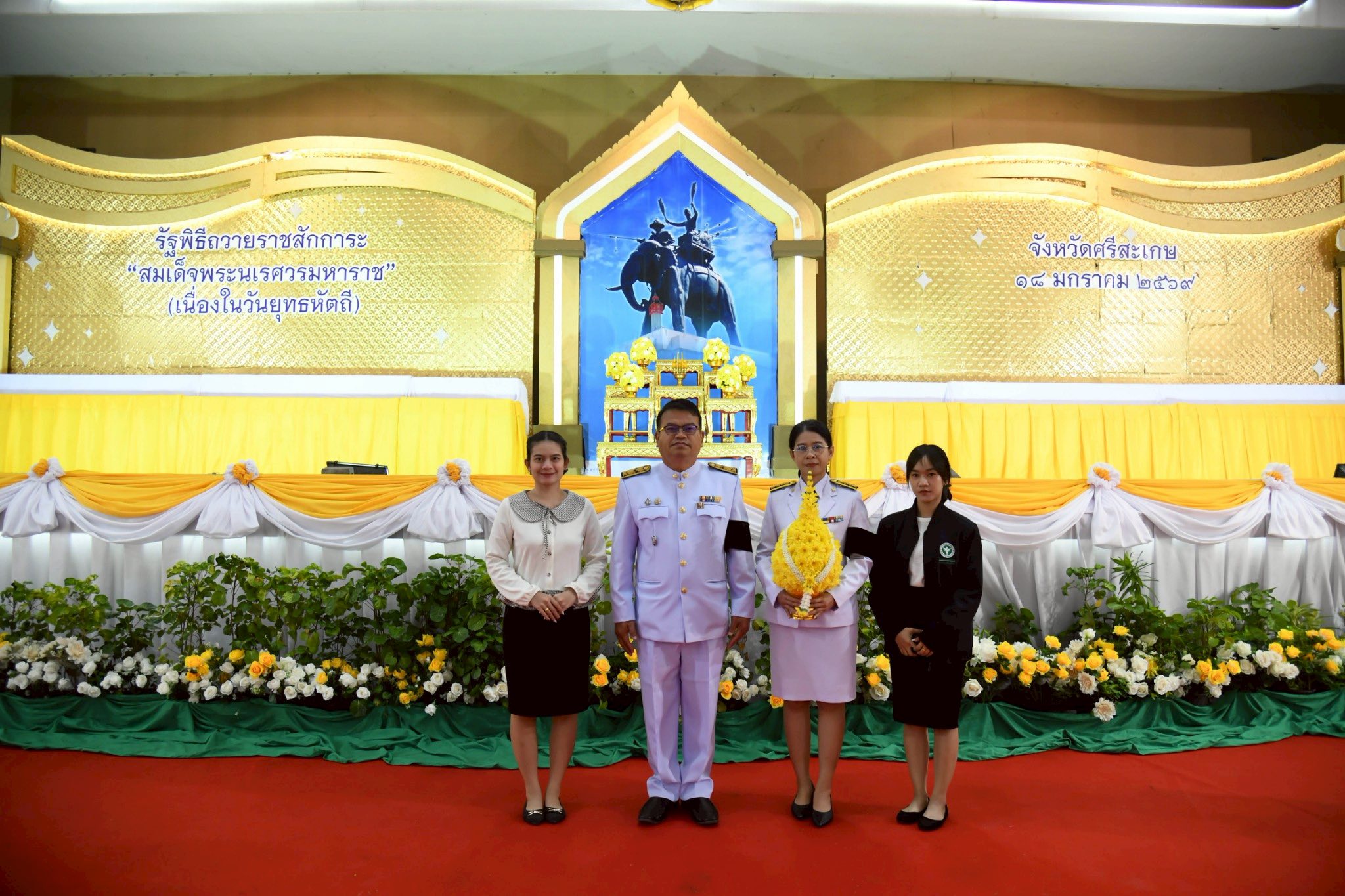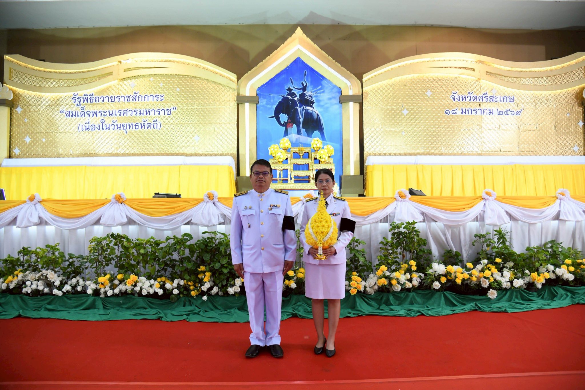 แพทย์หญิงแคทรียา เทนสิทธิ์ ผู้อำนวยการโรงพยาบาลศรีสะเกษ มอบหมายให้ นายสมคิด สุทธิคำภา นักวิชาการสาธารณสุขชำนาญการ พร้อมด้วย เจ้าหน้าที่โรงพยาบาลศรีสะเกษ ร่วมพิธีถวายราชสักการะสมเด็จพระนเรศวรมหาราช เนื่องในวันยุทธหัตถี เพื่อรำลึกถึงพระมหากรุณาธิคุณและพระวีรกรรมอันยิ่งใหญ่ของพระองค์ที่มีต่อชาติไทย โดยมี นายอนุรัตน์ ธรรมประจำจิต ผู้ว่าราชการจังหวัดศรีสะเกษ เป็นประธานในพิธี พร้อมด้วยหัวหน้าส่วนราชการ ข้าราชการ และพสกนิกรทุกหมู่เหล่าเข้าร่วมพิธี วันที่ 18 มกราคม 2569 ณ อาคารเฉลิมพระเกียรติฉลองสิริราชสมบัติครบ 60 ปี อำเภอเมืองศรีสะเกษ จังหวัดศรีสะเกษ