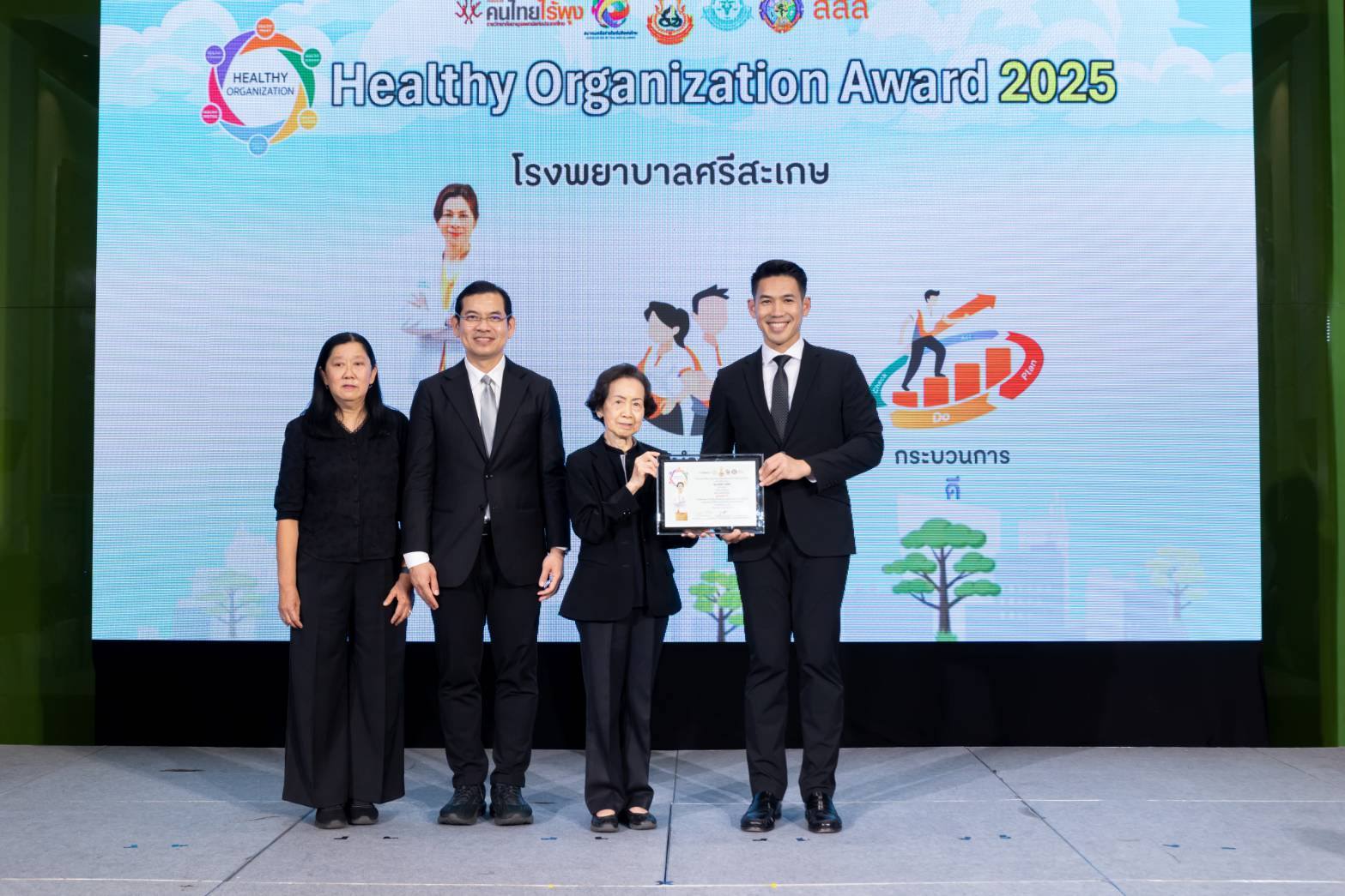 แพทย์หญิงแคทรียา เทนสิทธิ์ ผู้อำนวยการโรงพยาบาลศรีสะเกษ มอบหมายให้ นางสาวปิยมาศ จำรัสธนสาร รองผู้อำนวยการฝ่ายการพยาบาล นายแพทย์สิทธิพันธ์ จันทร์พงษ์ ผู้ช่วยผู้อำนวยการด้านพัฒนาคุณภาพบริการและมาตรฐาน พร้อมด้วย แพทย์ พยาบาล และบุคลากรโรงพยาบาลศรีสะเกษ ที่มีส่วนเกี่ยวข้อง ร่วมงาน Healthy Organization Day และพิธีมอบรางวัล Healthy Organization Award ตามที่ คณะกรรมการหลักสูตรอบรมผู้นำสุขภาพในสถานที่ทำงาน เครือข่ายคนไทยไร้พุง ราชวิทยาลัยอายุรแพทย์แห่งประเทศไทย จัดให้มีการส่งผลการดำเนินงานขององค์กรที่เข้ารับการอบรมหลักสูตรผู้นำสุขภาพในสถานที่ทำงาน โดยมีการพิจารณามอบรางวัลเพื่อเป็นขวัญและกำลังใจแก่องค์กร และผู้ปฏิบัติงานสร้างเสริมสุขภาพบุคลากรในองค์กร สร้างพื้นที่สุขภาวะในทุกที่ เพื่อสุขภาพดีอย่างยั่งยืน วันที่ 16 มกราคม 2569ณ ห้อง 201 อาคารศูนย์เรียนรู้สุขภาวะ สำนักงานกองทุนสนับสนุนการสร้างเสริมสุขภาพ