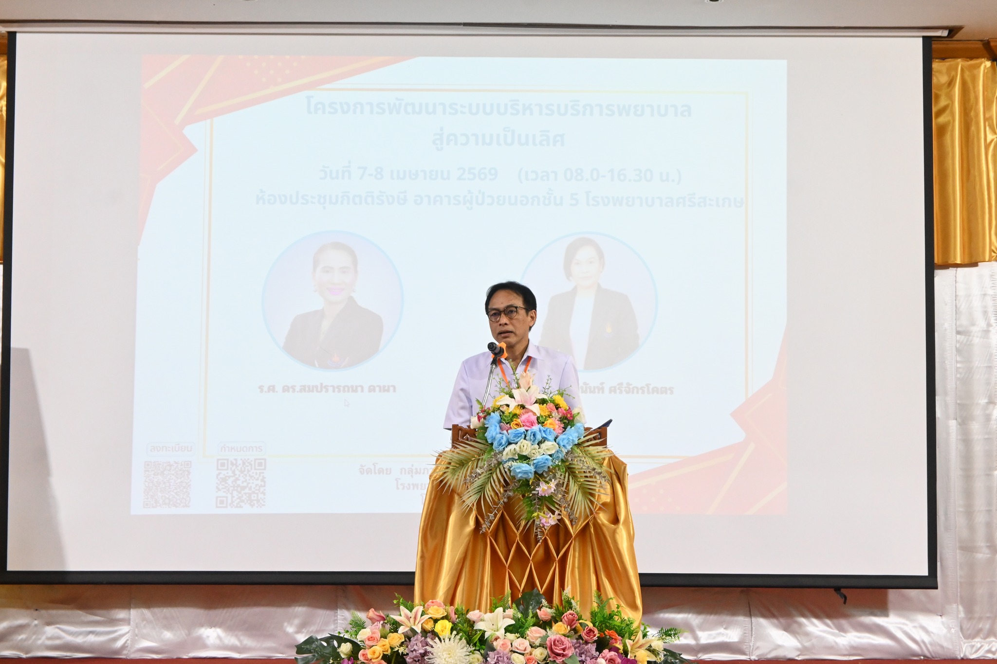 นายแพทย์ลักษณะเลิศ วรรณภาสนี ผู้อำนวยการโรงพยาบาลศรีสะเกษ ประธานในพิธีเปิดการอบรมโครงการพัฒนาระบบบริหารการพยาบาล สู่ความเป็นเลิศ ประจำปีงบประมาณ 2569