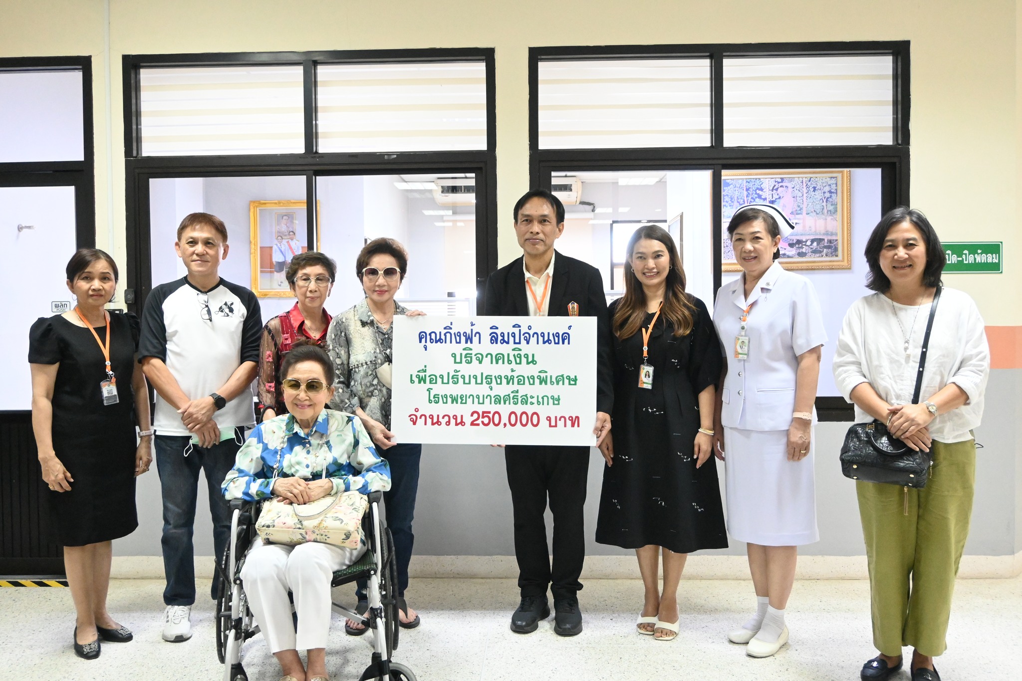 นายแพทย์ลักษณะเลิศ วรรณภาสินี ผู้อำนวยการโรงพยาบาลศรีสะเกษ พร้อมด้วย คณะผู้บริหาร แพทย์ พยาบาล และบุคคลากรโรงพยาบาลศรีสะเกษ ที่มีส่วนเกี่ยวข้อง รับบริจาค จากคุณกิ่งฟ้า ลิมปิจำนงค์ เพื่อปรับปรุงห้องพิเศษ โรงพยาบาลศรีสะเกษ จำนวน 250,000 บาท