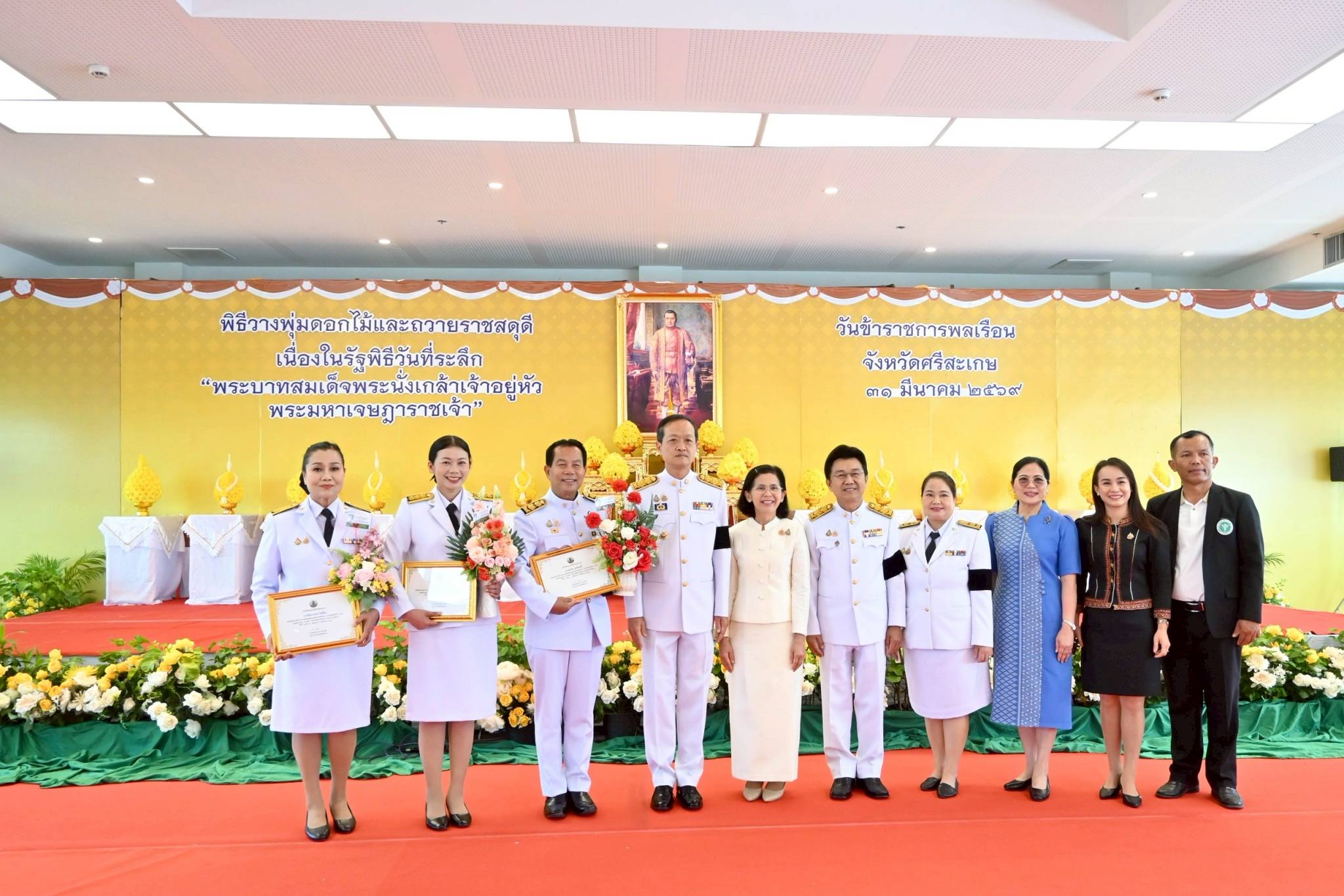 เภสัชกรวชิรา สุเมธิวิทย์ ผู้ช่วยผู้อำนวยการด้านวิชาการ คณะผู้บริหาร แพทย์ พยาบาล และเจ้าหน้าที่โรงพยาบาลศรีสะเกษ ที่มีส่วนเกี่ยวข้อง ร่วมพิธีวางพุ่มดอกไม้และถวายราชสดุดี เนื่องในวันที่ระลึก พระบาทสมเด็จพระนั่งเกล้าเจ้าอยู่หัว พระมหาเจษฎาราชเจ้าและวันข้าราชการพลเรือน ประจำปี พ.ศ.2569