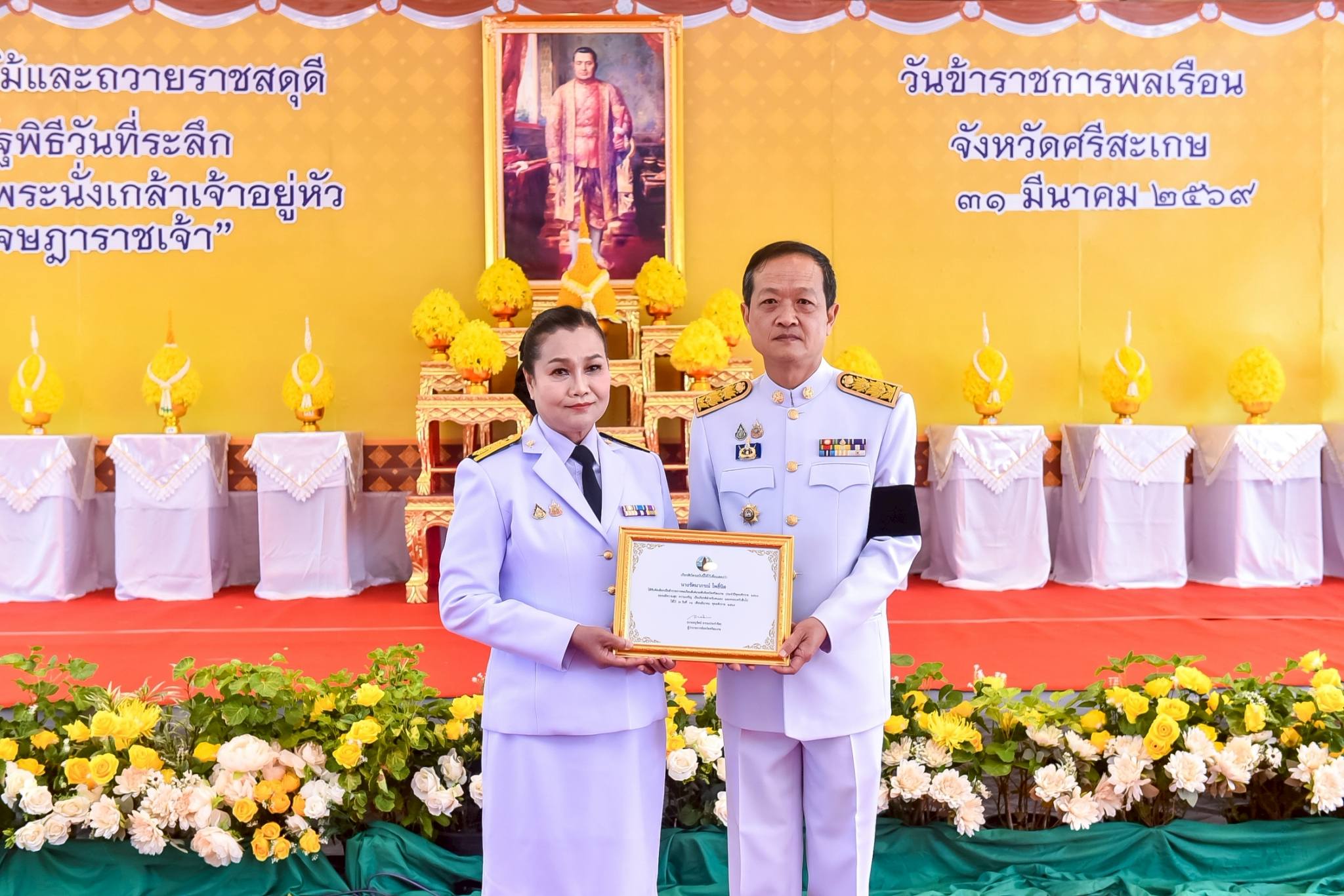 เภสัชกรวชิรา สุเมธิวิทย์ ผู้ช่วยผู้อำนวยการด้านวิชาการ คณะผู้บริหาร แพทย์ พยาบาล และเจ้าหน้าที่โรงพยาบาลศรีสะเกษ ที่มีส่วนเกี่ยวข้อง ร่วมพิธีวางพุ่มดอกไม้และถวายราชสดุดี เนื่องในวันที่ระลึก พระบาทสมเด็จพระนั่งเกล้าเจ้าอยู่หัว พระมหาเจษฎาราชเจ้าและวันข้าราชการพลเรือน ประจำปี พ.ศ.2569