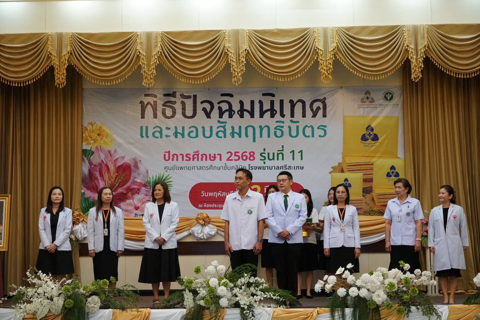 นายแพทย์ลักษณะเลิศ วรรณภาสินี ผู้อำนวยการโรงพยาบาลศรีสะเกษ ประธานในพิธีปัจฉิมนิเทศและมอบสัมฤทธิบัตร ประจำปีงบประมาณ 2568 รุ่นที่ 11